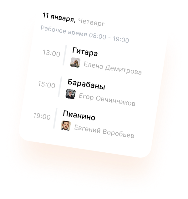 Чтобы записаться на занятие, выберите преподавателя, инструмент и удобное время через вкладку 'Бронирование'. Подтвердите запись, и занятие добавится в ваше расписание.