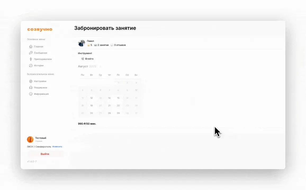 Откройте календарь, просмотрите доступные варианты занятий у преподавателя и забронируйте подходящее время. Запись на занятие занимает всего несколько секунд, а выбранное время автоматически добавляется в ваше расписание.
