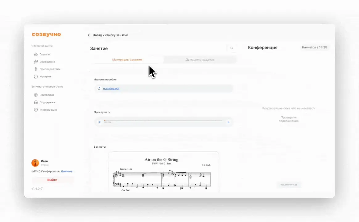Подключайтесь к видеозанятию прямо на платформе. В вашем распоряжении - встроенный метроном, интерактивная доска для заметок и все необходимые учебные материалы. Всё доступно в одном окне, без необходимости использовать дополнительные сервисы.